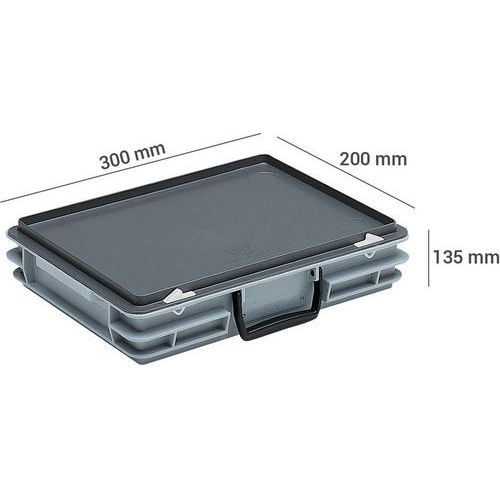 | Nome do artigo | Caixa-maleta Rako com tampa – padrão – C. 300 mm – UTZ, Capacidade: 5 L, Altura total: 135 mm |