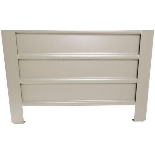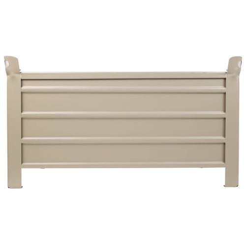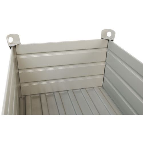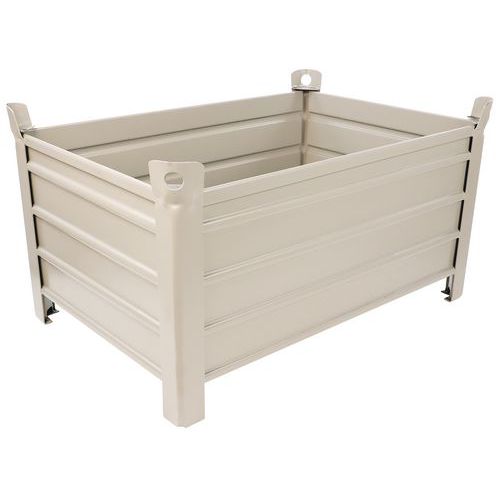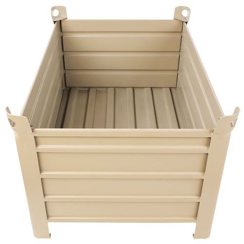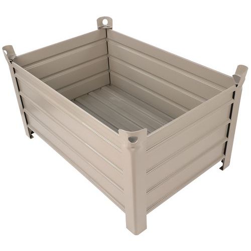 Extremamente resistente em chapa de aço canelada. Caixa-palete com paredes integrais. Poupança de espaço, com capacidade para empilhar 5 caixas-palete. Empilhamento de grande estabilidade com perfis de canto montantes. Adequada para indústrias mecânicas, automóveis, fundições ou de recolha de resíduos.