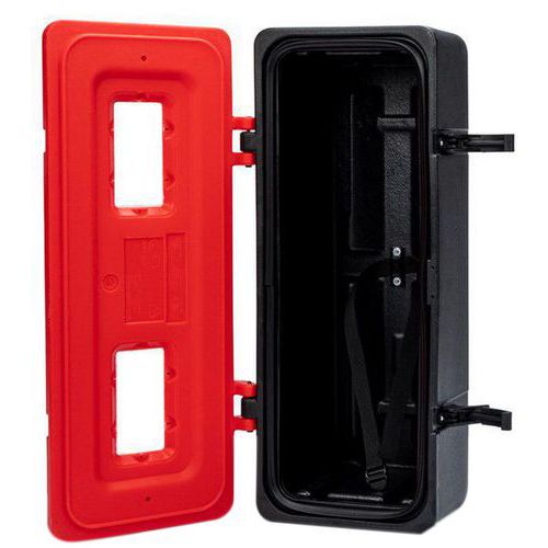Caixa para 1 extintor, Material: Polietileno de alta densidade, Cores: Vermelho/preto