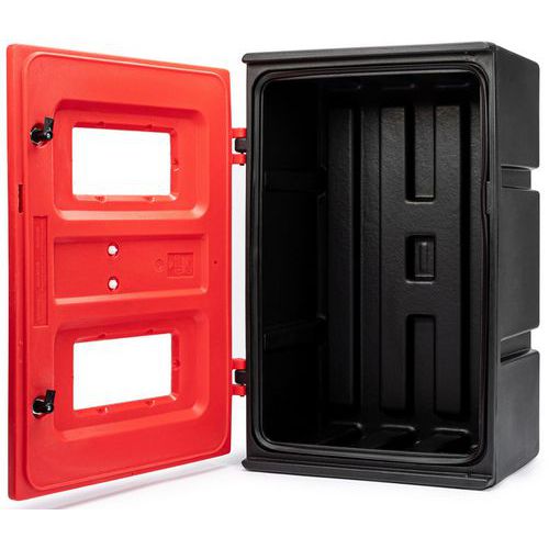 | Nome do artigo | Caixa para extintor – chave sob vidro – série 85 – Jonesco, Material: Polietileno, Cores: Vermelho/preto |