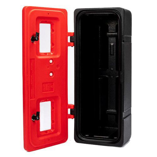 Caixa para extintor de 9 a 12 kg com fecho com chave – Jonesco, Material: Polietileno, Cores: Vermelho/preto