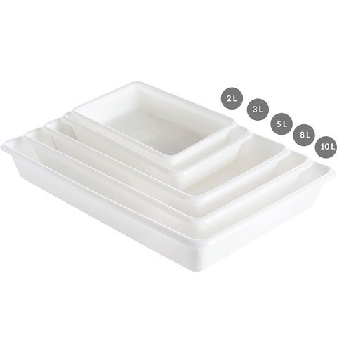 Caixa plana multifunções para alimentos: preparação, marinada, decantação, descongelação, armazenamento de amostras de controlo... Especialmente concebida para a indústria alimentar. Ocupação mínima de espaço através de encaixe quando está vazia. formato perfeitamente adaptado para frigoríficos.