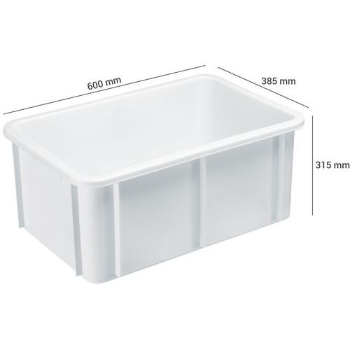 Caixa plástica de qualidade alimentar, retangular, em conformidade com as dimensões de norma europeia.