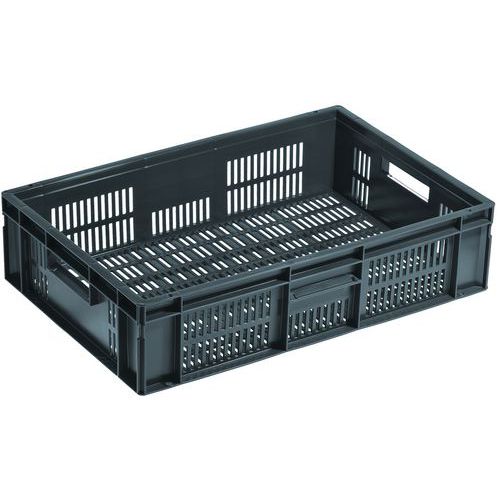 Caixas empilháveis de norma europeia de 600 x 400 mm em material regenerado disponíveis em diferentes alturas. As caixas têm um fundo integral com paredes gradeadas ou um fundo gradeado e paredes gradeadas. Além disso, todas as caixas têm pegas com orifícios nos lados pequenos.