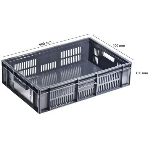 Caixas empilháveis de norma europeia de 600 x 400 mm em material regenerado disponíveis em diferentes alturas. As caixas têm um fundo integral com paredes gradeadas ou um fundo gradeado e paredes gradeadas. Além disso, todas as caixas têm pegas com orifícios nos lados pequenos.