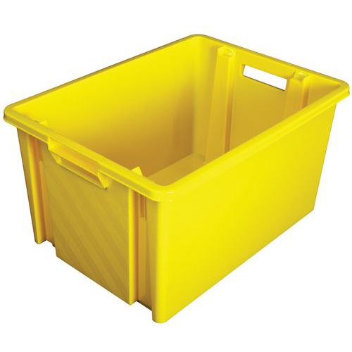 Caixa encaixável equipada com pegas abertas para facilitar a deslocação.