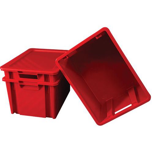 Caixa encaixável equipada com pegas abertas para facilitar a deslocação.