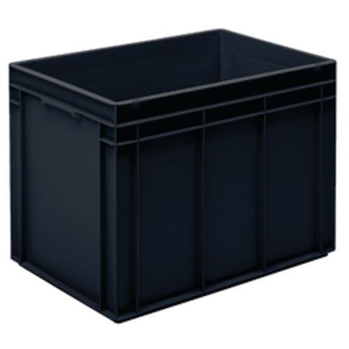 Caixas empilháveis de norma europeia fabricadas em material condutor que incluem paredes integrais, um fundo integral ou compacto e duas pegas integrais ou em forma de concha. Fabricado na UE