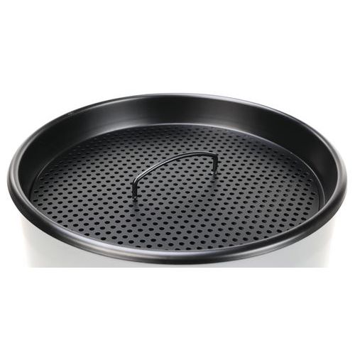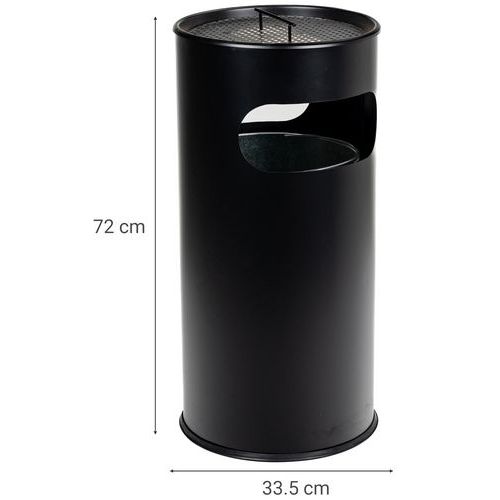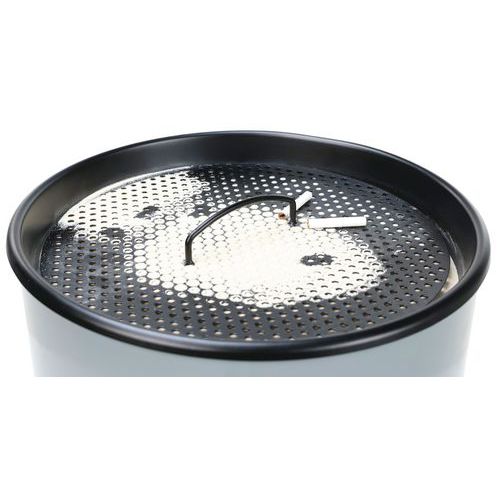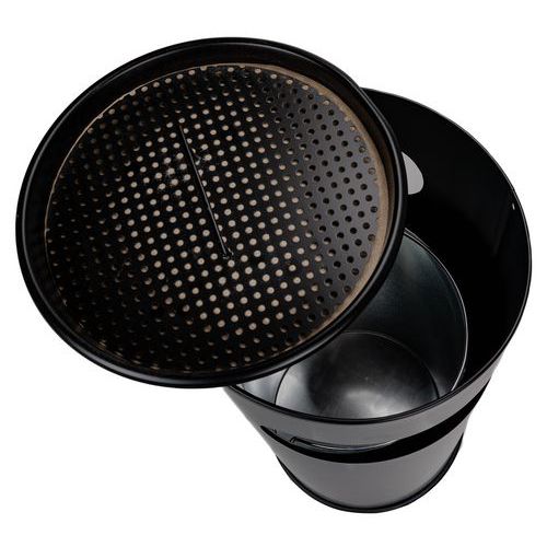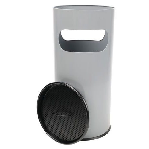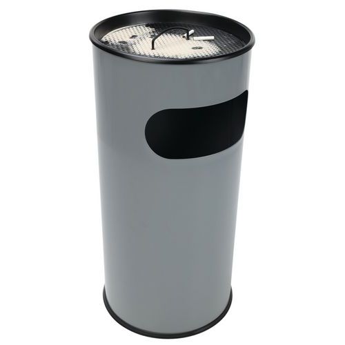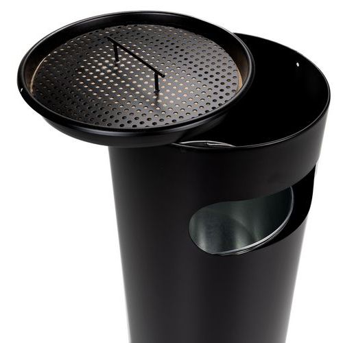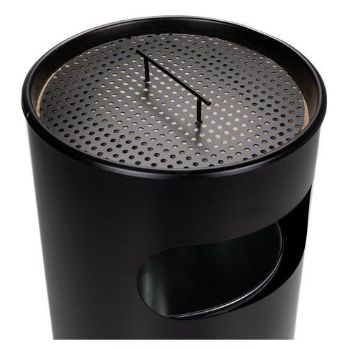 Caixote de lixo/cinzeiro antifogo, redondo, com invólucro em metal. Equipado com rede e placa preta. Grelha capaz de apagar beatas facilmente. Pega na parte superior para facilitar o esvaziamento.