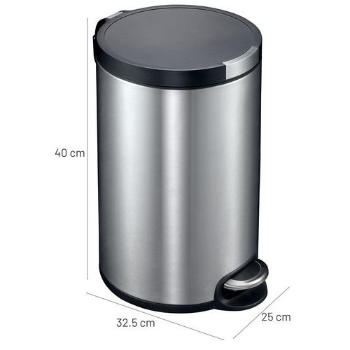 Caixote de lixo redondo, com tampa de plástico e pedal saliente da plataforma em inox. Invólucro em plástico e fecho silencioso.