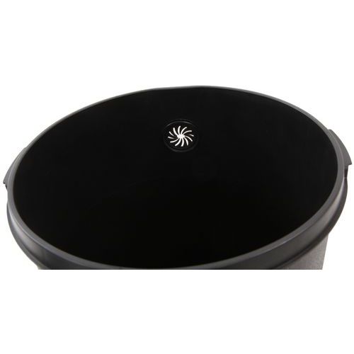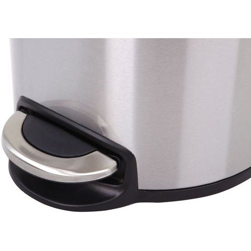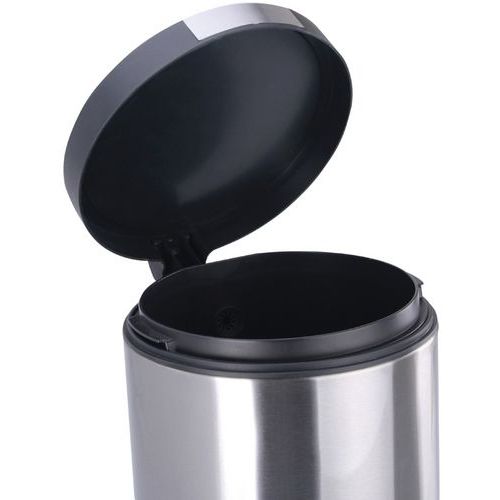 Caixote de lixo redondo, com tampa de plástico e pedal saliente da plataforma em inox. Invólucro em plástico e fecho silencioso.
