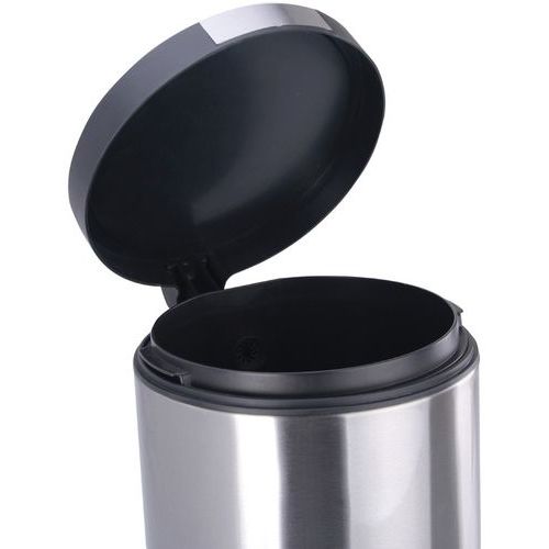 Caixote de lixo redondo, com tampa de plástico e pedal saliente da plataforma em inox. Invólucro em plástico e fecho silencioso.
