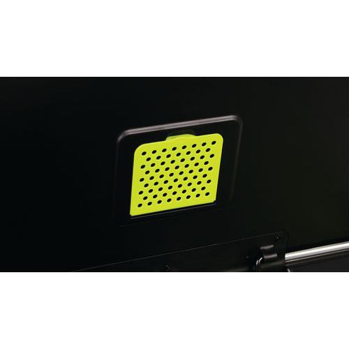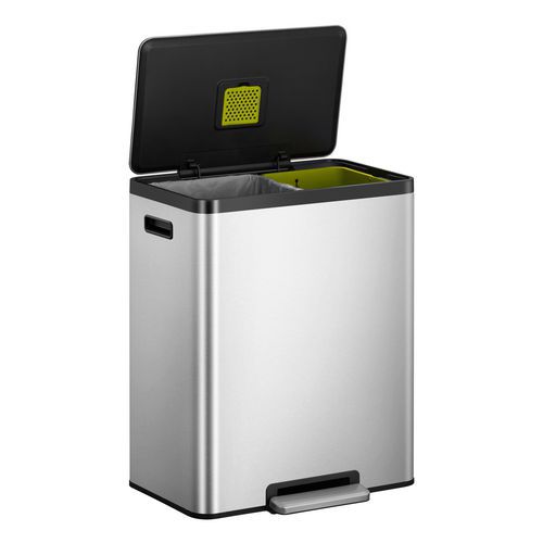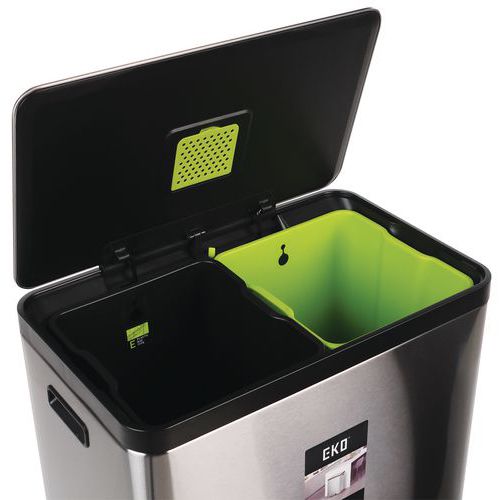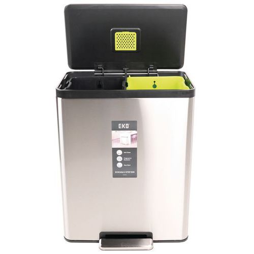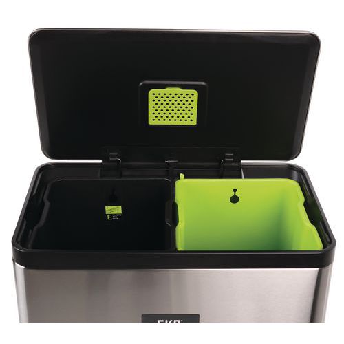 Equipado com uma tampa de fecho suave com filtro de odores integrado e dois invólucros sintéticos (2 x 30 L) para separação seletiva.