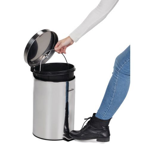 Caixote de lixo com balde interior. Asa de preensão para facilitar o esvaziamento. Base em borracha para proteger os pisos. Resistente à corrosão.