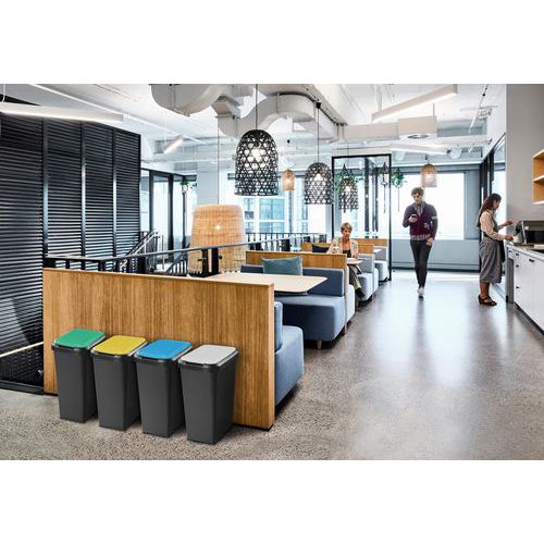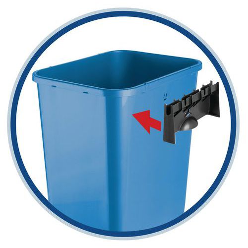 Caixote de lixo de separação seletiva de resíduos (papel, plástico, vidro, biorresíduos). Forma retangular para um aumento mínimo de volume. . Tampa com dois sistemas de abertura: por pressão ou basculamento. . Sistema de engate fornecido. Permite formar uma ilha. Compatível com sacos de lixo de 50 L. Disponível em várias cores.