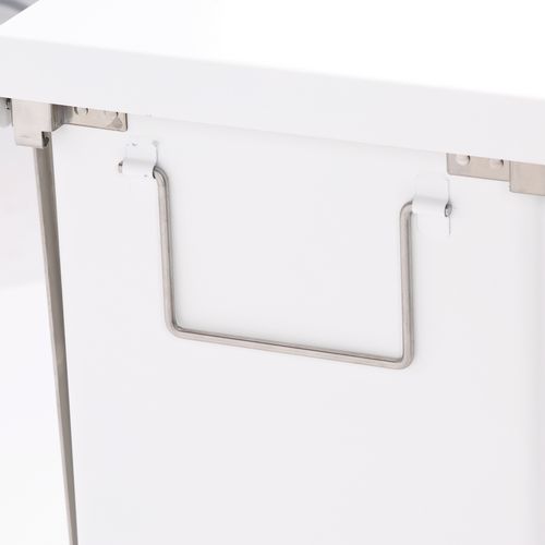 Este caixote de lixo branco robusto abre-se através de um pedal e é resistente ao fogo e às intempéries.