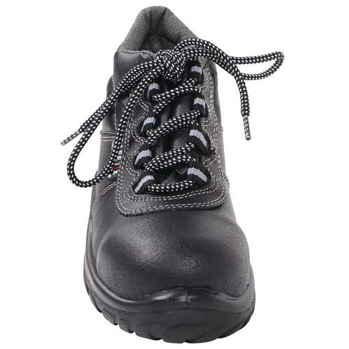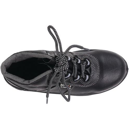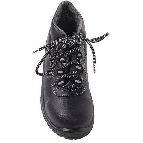 Calçado de segurança alto com biqueira de proteção em policarbonato e sola antiderrapante Parte superior em couro granulado com 2,0-2,2 mm de espessura para uma melhor resistência mecânica e durabilidade Ideal para pisos e ambientes industriais Sola injetada PU2D leve, flexível e antiderrapante, graças a uma estrutura de relevos aberta para uma melhor evacuação dos líquidos Calcanhar elevado para maior segurança, especialmente em escadas