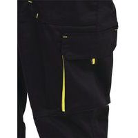 Calças de trabalho contemporâneas para vários domínios de utilização. Cintura com elástico nos lados. Presilha para cinto. Braguilha com fecho de correr e botão. Vários bolsos variados à frente e atrás.