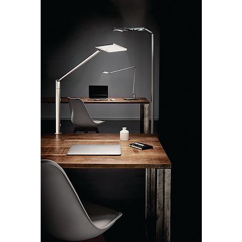 Candeeiro de secretária LED com um design extremamente compacto e um elegante braço articulado em alumínio com 2 elementos e passagem de cabos invisível. Base em pinça. Potência de 4000 K Fabricado na Alemanha