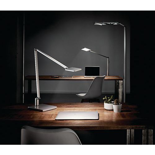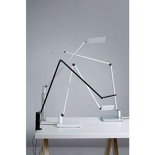 Candeeiro de secretária LED com um design extremamente compacto e um elegante braço articulado em alumínio com 2 elementos e passagem de cabos invisível. Base em pinça. Comprimento aproximado do cabo de 2 m. Tonalidade da luz: branca quente (temperatura de cor de 3000 K) Fabricado na Alemanha
