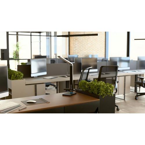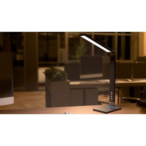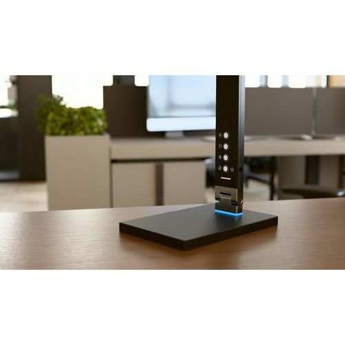Candeeiro LED versátil com regulador de intensidade da luz tátil com 5 níveis e função de memória para uma iluminação personalizada. Luz de presença azul ajustável, para uma ambiente relaxante ou para uma utilização noturna sem encadeamento. Três níveis de temperatura da cor, desde o branco quente à luz natural, para se adaptar a todas as atividades. Porta USB incorporada (5 V 2,1 A) que permite carregar facilmente os seus dispositivos móveis. Design dobrável e cabeça ajustável para um posicionamento ideal e poupança de espaço na secretária.