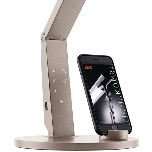 - Conforme necessário, o suporte com íman para os aparelhos móveis pode ser fixado no pé do candeeiro.