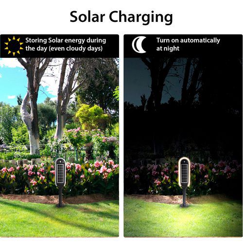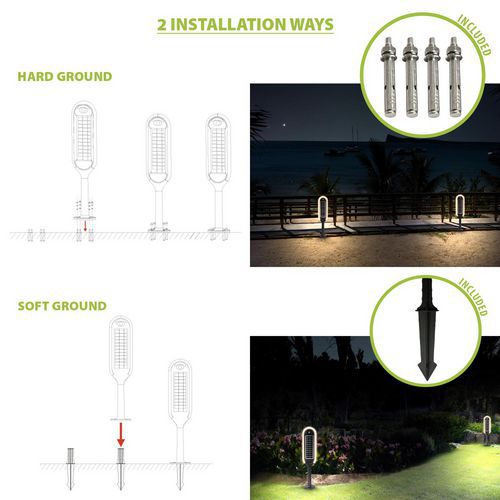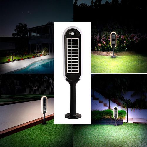 2 modos de funcionamento: Modo de deteção: o candeeiro liga-se automaticamente à noite. Acende-se com luminosidade total (400 lm) quando deteta movimento a uma distância ≤ a 7 metros e, em seguida, reduz a luminosidade após 20 segundos sem detetar movimento. Modo de iluminação contínua: o candeeiro acende-se automaticamente à noite e mantém uma luminosidade de 50%. Após 5 horas (ou quando a carga da bateria for inferior a 30%), o candeeiro muda para o modo de deteção. O candeeiro está equipado com LED SMD de última geração com um difusor potente: a luz é homogénea. Luz de 4000 K: nem demasiado quente, nem demasiado fria. 2 modos de fixação: com parafusos ou com uma estaca (ambos fornecidos).