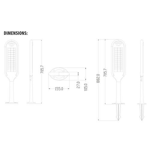 Candeeiro solar LED em policarbonato, com design contemporâneo e extremamente requintado. Resistente a impactos e intempéries, a parte eletrónica é particularmente resistente à água. Equipado com um painel solar duplo na parte da frente e na parte traseira de 6 W para garantir a máxima carga de energia. Bateria de iões de lítio de 2000 mAh, carrega durante o dia e liga-se automaticamente ao anoitecer. O candeeiro carrega durante o dia graças aos raios solares.