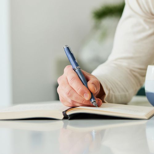 A coleção de canetas Parker IM Writing Rituals foi concebida tendo em consideração as rotinas de bem-estar dos seus utilizadores. O peso, o estilo, o manuseamento e a fluidez da tinta criam uma sensação de luxo enquanto promovem a concentração durante a escrita. O efeito da gradação em azul plácido e o acabamento metalizado com efeito acetinado proporcionam um equilíbrio perfeito com o acabamento cromado. Com inspiração na teoria das cores, cada tinta foi selecionada pelas suas propriedades calmantes, inspiradoras ou energizantes. A Parker IM Writing Rituals apresenta-se num estojo elegante com uma bolsa a condizer. Esta moderna caneta de tita permanente pode ser utilizada com cartuchos de tinta Quink ou um frasco de tinta, graças ao seu conversor. Permite uma escrita ainda mais sofisticada.