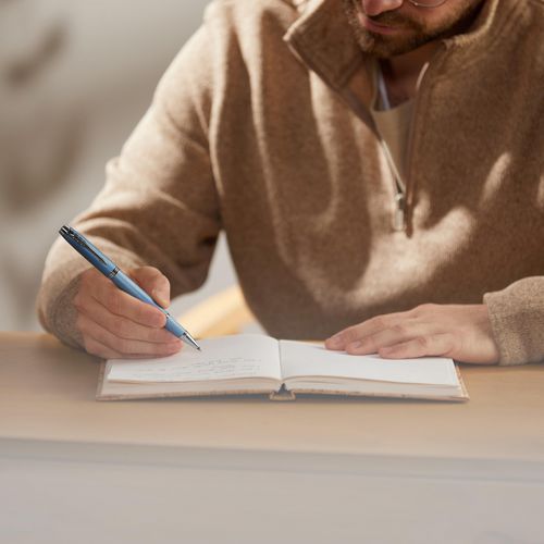 A coleção de canetas Parker IM Writing Rituals foi concebida tendo em consideração as rotinas de bem-estar dos seus utilizadores. O peso, o estilo, o manuseamento e a fluidez da tinta criam uma sensação de luxo enquanto promovem a concentração durante a escrita. O efeito da gradação em azul plácido e o acabamento metalizado com efeito acetinado proporcionam um equilíbrio perfeito com o acabamento cromado. Com inspiração na teoria das cores, cada tinta foi selecionada pelas suas propriedades calmantes, inspiradoras ou energizantes. A Parker IM Writing Rituals apresenta-se num estojo elegante com uma bolsa a condizer. A ponta com esfera garante a fluidez e uniformidade da tinta no papel.