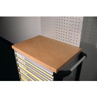 Superfície de depósito e de trabalho adicional, com revestimento em madeira resistente ou plástico antiderrapante e compartimentos para pequenos objetos