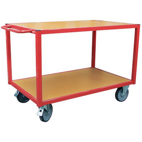Extremamente robusto: tubos de aço mecanossoldado. Perfis de secção resistente de 4 x 4 mm. Plataformas em MDF de 16 mm, protegidas por verniz, encastradas e rebitadas. Carro com acabamento epóxi antichoque. Barra de manobra horizontal: ocupação de espaço reduzida em altura. Grandes plataformas adaptadas aos seus processos de preparação de encomendas em paletes de norma europeia