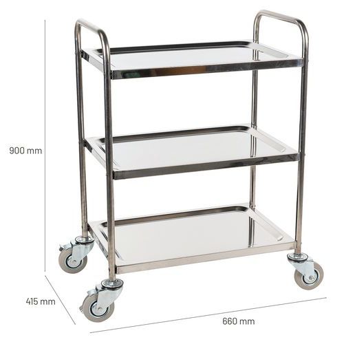 | Nome do artigo | Carro em inox, Capacidade: 100 kg, Altura total: 900 mm, Largura total: 415 mm, Comprimento total: 660 mm |