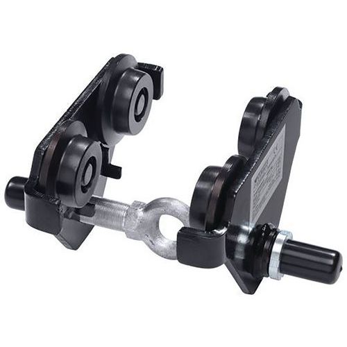 Carro porta-diferencial manual de montagem fácil, permitindo suspender um diferencial com um gancho de suspensão. Montados sobre um rolamento de esferas, os roletes são torneados, encapsulados e de lubrificação permanente. Placas laterais com sistema de segurança antiescalada e antiqueda. Adaptação contínua a ferros de diferentes larguras.