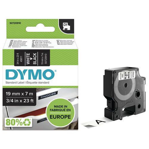 Cassete de fita D1 com 19 mm de largura – Dymo, Fundo cor: Preto, Tipo: S0720910, Fita comp.: 7 m Cassete de fita D1 com 19 mm de largura – Dymo, Fundo cor: Preto, Tipo: S0720910, Fita comp.: 7 m