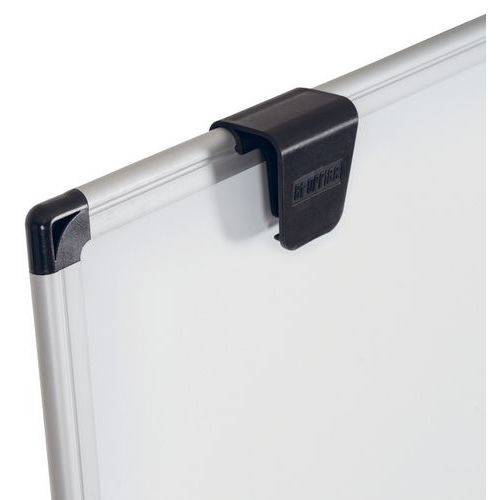 Inclui ganchos reguláveis para blocos de papel para cavaletes e uma plataforma de suporte de plástico na parte de trás do quadro.