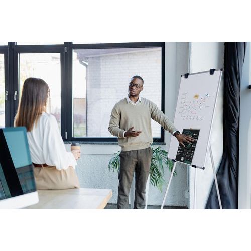 Escreva num bloco de papel para cavalete de conferência ou diretamente no quadro branco que pode ser usado em posições de retrato ou paisagem.