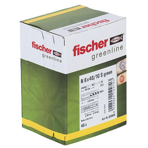 | Nome do artigo | Cavilha de punção N Green 6 40 10 S – Fischer, Cavilha comp.: 40 mm, Diâmetro Ø: 6 mm, Material: Nylon |