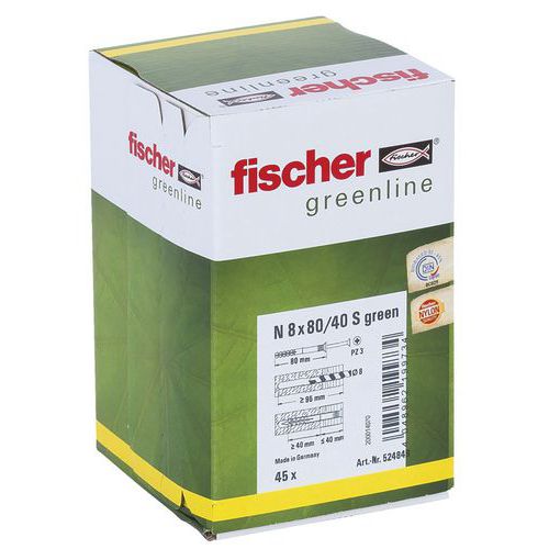 | Nome do artigo | Cavilha de punção N Green 8 80 40 S – Fischer, Cavilha comp.: 80 mm, Ø: 8 mm, Material: Nylon |