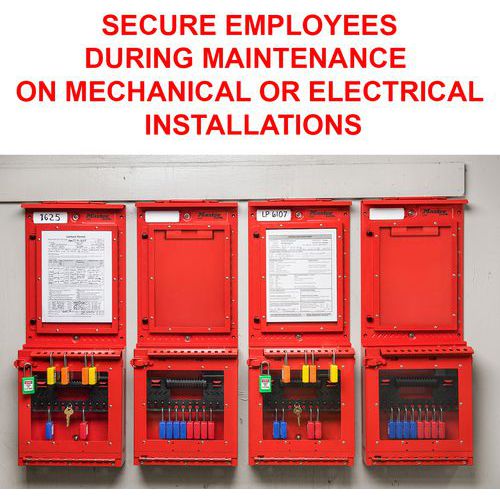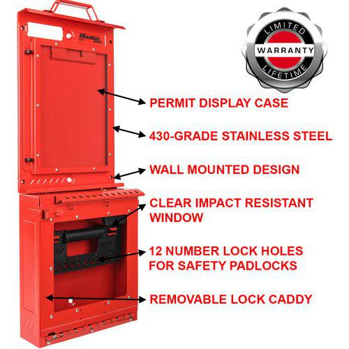 O centro de segurança inclui um painel de visualização de autorizações de trabalho (modelo n.º S3501) e uma caixa de segurança de grupo montada na parede (modelo n.º S3502), e ainda uma pega de transporte.