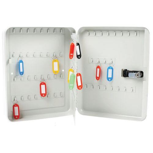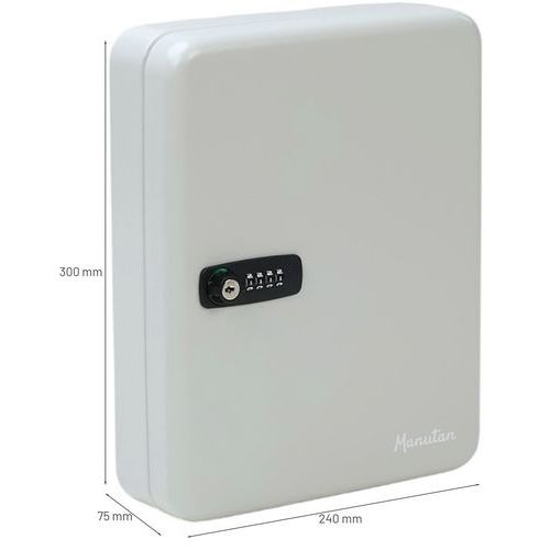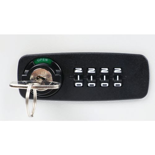 Chaveiro com fechadura com código e com chave. Acabamento com tinta em pó duradoura de elevada qualidade. Para garantir uma proteção ideal, foi concebido com uma fechadura com um código de combinação através de botão de pressão mecânico. Foi concebido para proteger todas as suas chaves no trabalho ou em casa. Disponível em várias versões (capacidade para 20 a 100 chaves).