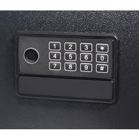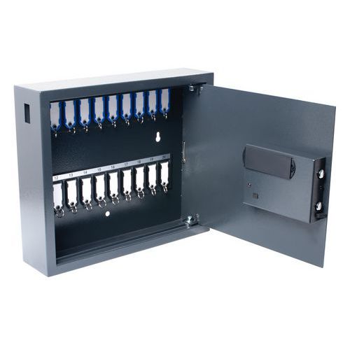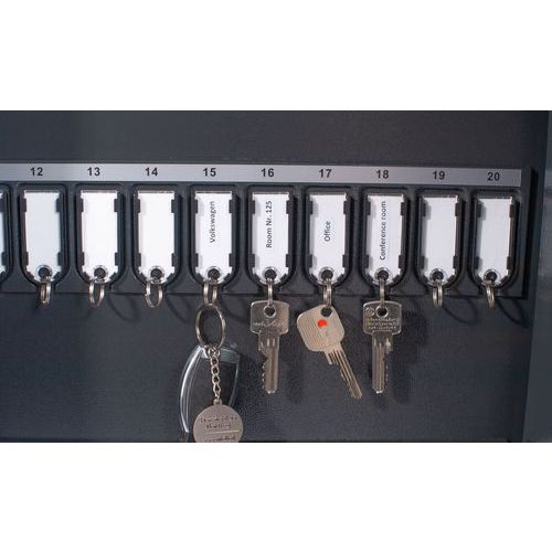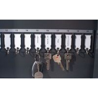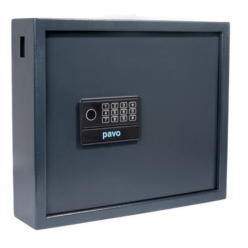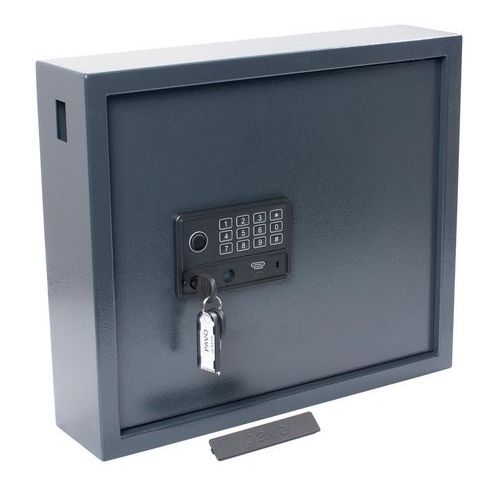 O chaveiro Magnettag é fornecido com 10 porta-chave magnéticos. Tal como qualquer outro chaveiro Pavo, este armário também tem um entalhe para colocar as chaves. Armário fechado com um sistema antiarrombamento. Este chaveiro magnético permite-lhe aceder facilmente aos seus objetos de valor com três opções de bloqueio. A fechadura eletrónica reforçada permite todas as combinações de 3 a 8 dígitos, com milhões de combinações possíveis para maior fiabilidade e segurança. Junto com o chaveiro, são também fornecidas duas chaves de emergência para acesso manual. As impressões digitais confirmam a integridade do acesso ao compartimento. Na entrega estão incluídas 2 chaves de emergência, material de montagem, 10 porta-chaves Magnettag pretos. Conceção robusta com uma porta de 4 mm de espessura e um contorno de 2 mm.