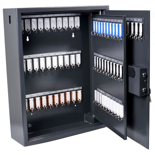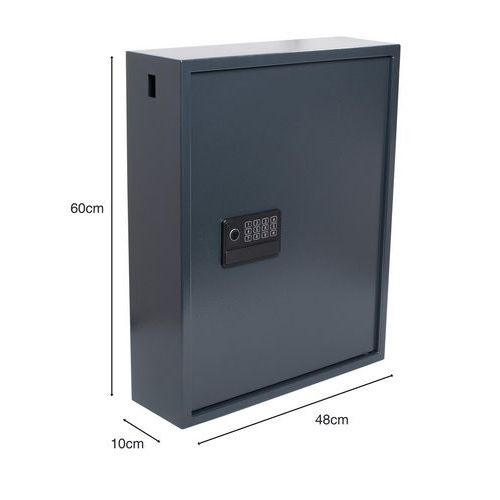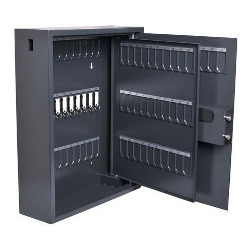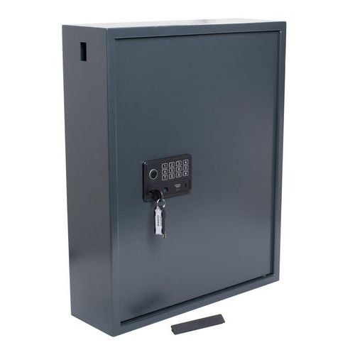 O chaveiro Magnettag é fornecido com 10 porta-chave magnéticos. Tal como qualquer outro chaveiro Pavo, este armário também tem um entalhe para colocar as chaves. Armário fechado com um sistema antiarrombamento. Este chaveiro magnético permite-lhe aceder facilmente aos seus objetos de valor com três opções de bloqueio. A fechadura eletrónica reforçada permite todas as combinações de 3 a 8 dígitos, com milhões de combinações possíveis para maior fiabilidade e segurança. Junto com o chaveiro, são também fornecidas duas chaves de emergência para acesso manual. As impressões digitais confirmam a integridade do acesso ao compartimento. Na entrega estão incluídas 2 chaves de emergência, material de montagem, 10 porta-chaves Magnettag pretos. Conceção robusta com uma porta de 4 mm de espessura e um contorno de 2 mm.