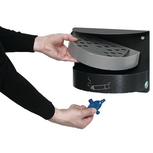 Cinzeiro de parede exterior com cobertura de proteção contra a chuva. Resistência às condições atmosféricas com revestimento em pó de epóxi anti-UV. Robusto: construção duradoura de qualidade, material de chapa de aço galvanizada. Cinzeiro de esvaziamento facilitado, protegido por chave de palhetão duplo (1 chave), antirroubo.