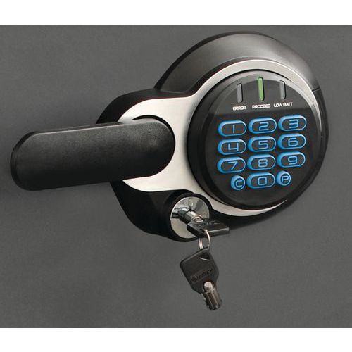 - Fechadura numérica com combinação (de código) retroiluminada e um tampo ajustável.