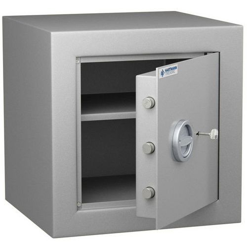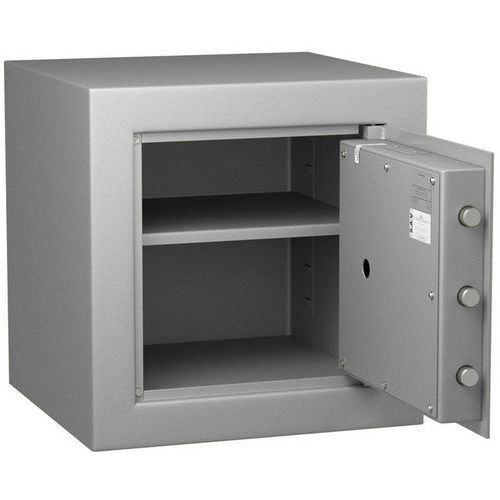 Cofre-forte série Vulcain de 40 a 205 litros. Proteção anti-intrusão em conformidade com a norma alemã VDMA, nível B. Blindagem antiperfuração em manganês do sistema de bloqueio. Prateleira regulável em altura. Orifício de fixação na base de ø14 mm. Entrega mediante agendamento prévio no local definido pelo cliente com recolha de embalagens para reciclagem. Rés-do-chão com um máximo de 2 degraus ou andar com elevador. Máximo de 20 metros de distância. Para todos os pedidos de entrega mais específicos, contacte o nosso serviço de apoio ao cliente (locais de acesso difícil, íngremes ou adversos).