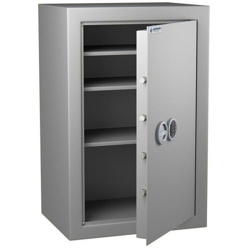 Cofre-forte série Vulcain de 40 a 205 litros. Proteção anti-intrusão em conformidade com a norma alemã VDMA, nível B. Blindagem antiperfuração em manganês do sistema de bloqueio. Prateleira regulável em altura. Entrega mediante agendamento prévio no local definido pelo cliente com recolha de embalagens para reciclagem. Rés-do-chão com um máximo de 2 degraus ou andar com elevador. Máximo de 20 metros de distância. Para todos os pedidos de entrega mais específicos, contacte o nosso serviço de apoio ao cliente (locais de acesso difícil, íngremes ou adversos).