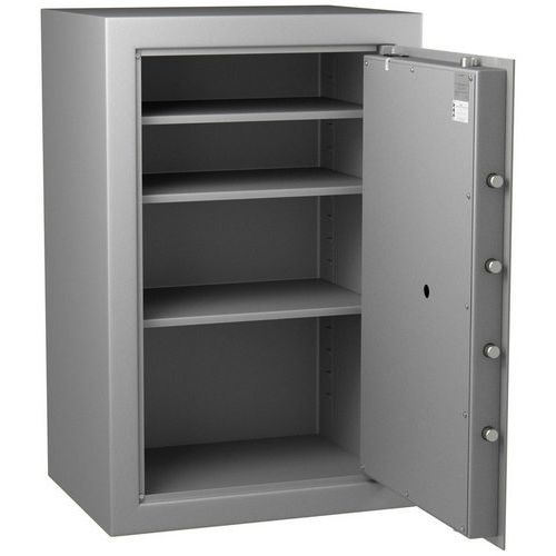 Cofre-forte série Vulcain de 40 a 205 litros. Proteção anti-intrusão em conformidade com a norma alemã VDMA, nível B. Blindagem antiperfuração em manganês do sistema de bloqueio. Prateleira regulável em altura. Entrega mediante agendamento prévio no local definido pelo cliente com recolha de embalagens para reciclagem. Rés-do-chão com um máximo de 2 degraus ou andar com elevador. Máximo de 20 metros de distância. Para todos os pedidos de entrega mais específicos, contacte o nosso serviço de apoio ao cliente (locais de acesso difícil, íngremes ou adversos). VDS