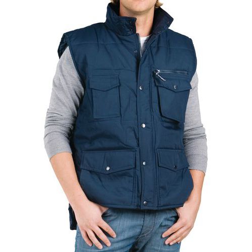 Fecho de correr até ao pescoço coberto por pala com botões de pressão.