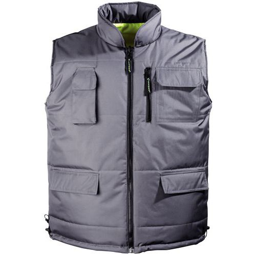 Face com 2 faixas retrorrefletoras cosidas e uma face cinzenta. Vários bolsos. Costuras estanques e soldadas. Fecho de correr com duplo sentido. Colete com proteção lombar. Ajuste da base através de cordão elástico com dispositivo de bloqueio de cordões. CE